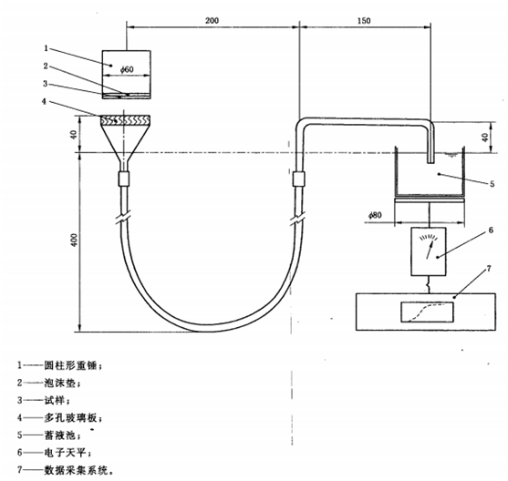 将试样放置在专用的多孔板上,多孔板通过虹吸管与蓄液池里的液面低于多孔板的上表面,通过测定蓄液池的质量随时间的变化来获得织物的受压吸收性。