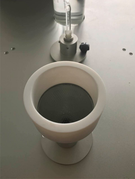 3、蓄液池中加水,使水面没过玻璃导管底端;从漏斗的一端加水,使导管内充满水,然后用一直手堵住玻璃导管一端,同时另一只手往漏斗内加水,水面和漏斗表面齐平,然后把多孔玻璃板盖到漏斗顶部,再用干燥的洁净抹布擦拭多孔玻璃板表面,然后把所测试样放到多孔玻璃板上,盖上圆柱形重锤;调节U形管水平部分上端的外表面比蓄液池内液面高出(40±0.5)mm。